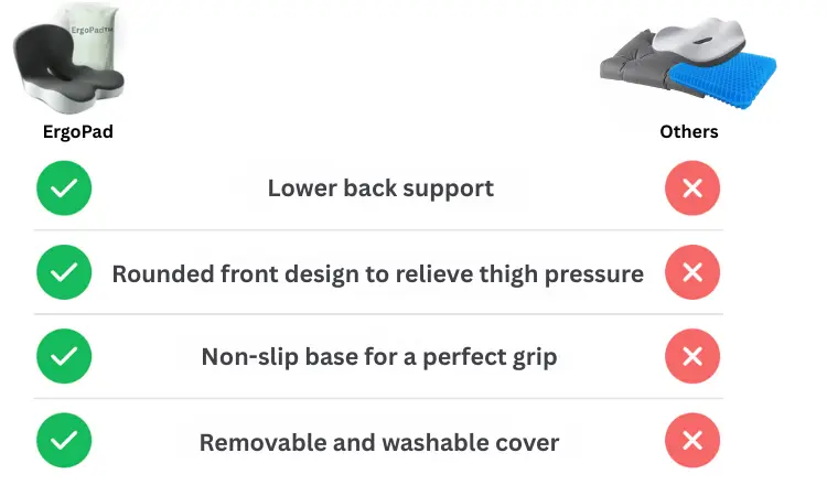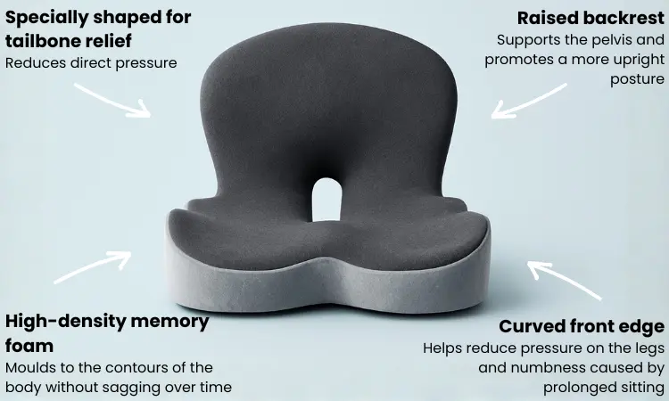 ✔︎ A central cutout specifically for the tailbone. Unlike traditional flat cushions, the