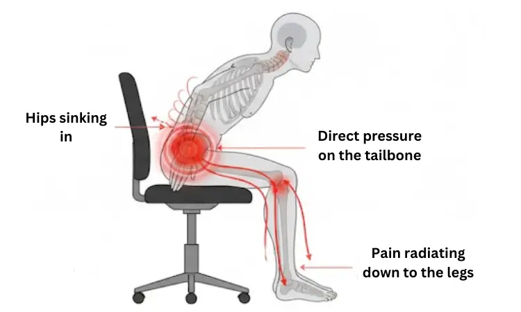 Standard chairs, sofas and armchairs let your hips sink in, your lower back round, and your entire body weight press directly onto your tailbone. After 30 to 60 minutes, this pressure can turn into stiffness, then into discomfort that spreads all the way down to your legs.